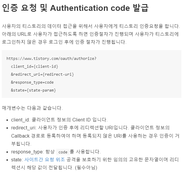 https://www.tistory.com/oauth/authorize? client_id=95XXXXXXXXXXXXX &redirect_uri=https://hzoo.tistory.com/ &response_type=code &state=someValue
