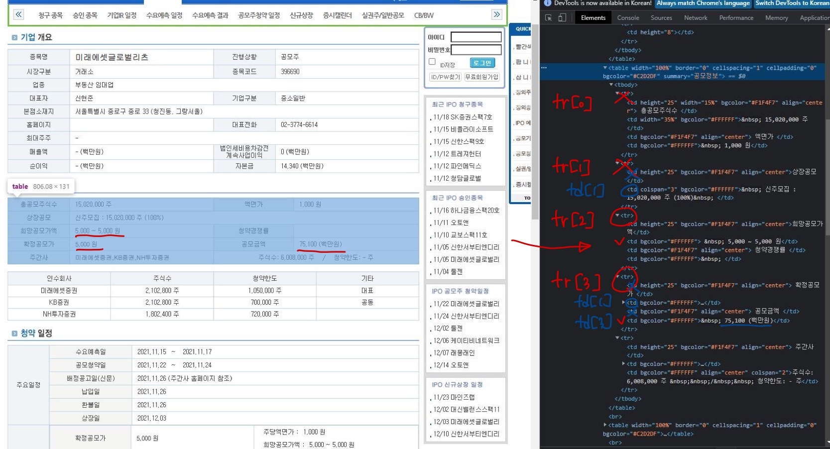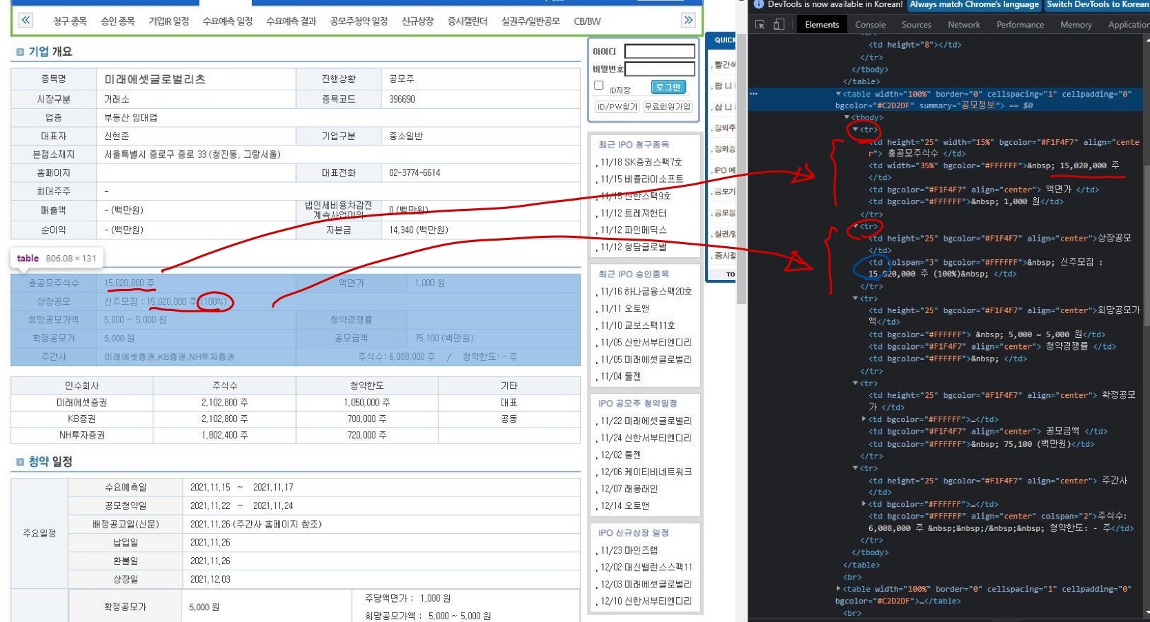 위에 표기해둔 정보는 한 url에 모두 담겨있으므로(ipostock과 다르게), 먼저 html 코드를 가져온다.
