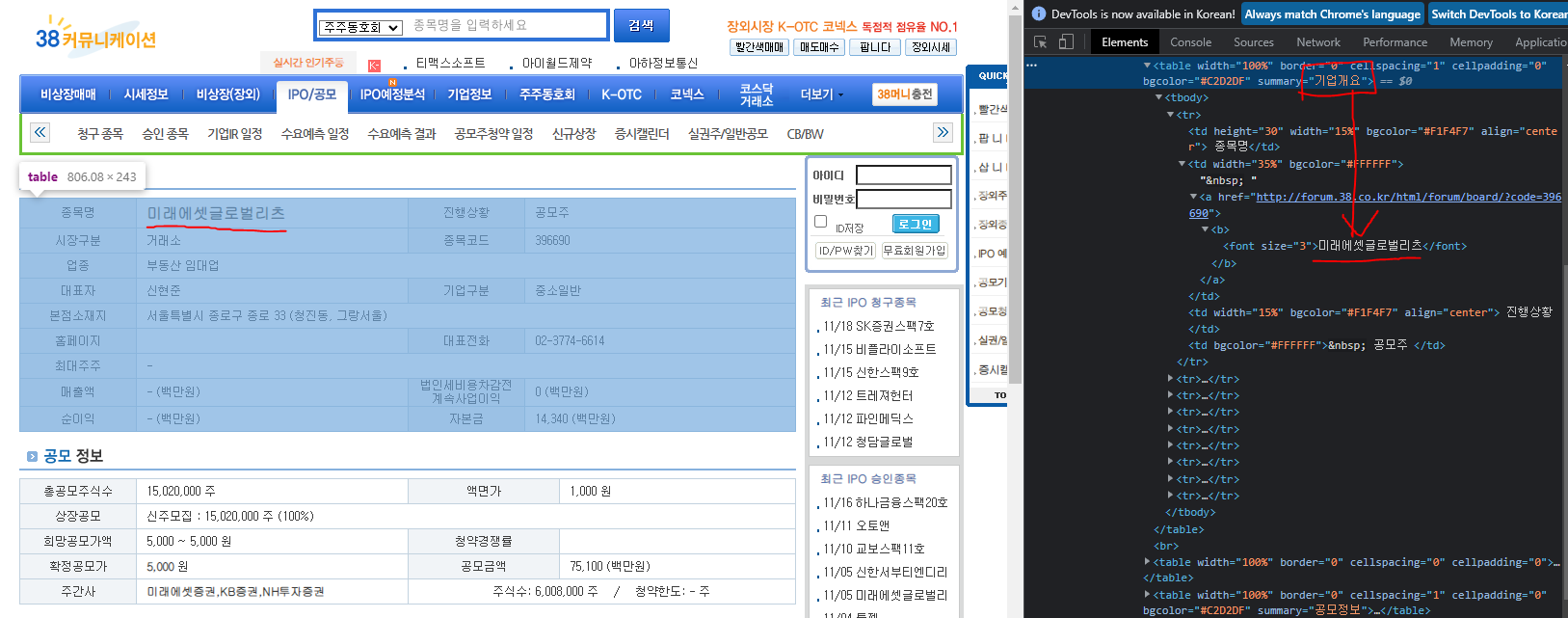 ipostock에서 1차적으로 정보를 가져오지만 ipostock에서 가끔 늦게 업데이트되는 이유로 38 커뮤니케이션을 크롤링하기 때문에,