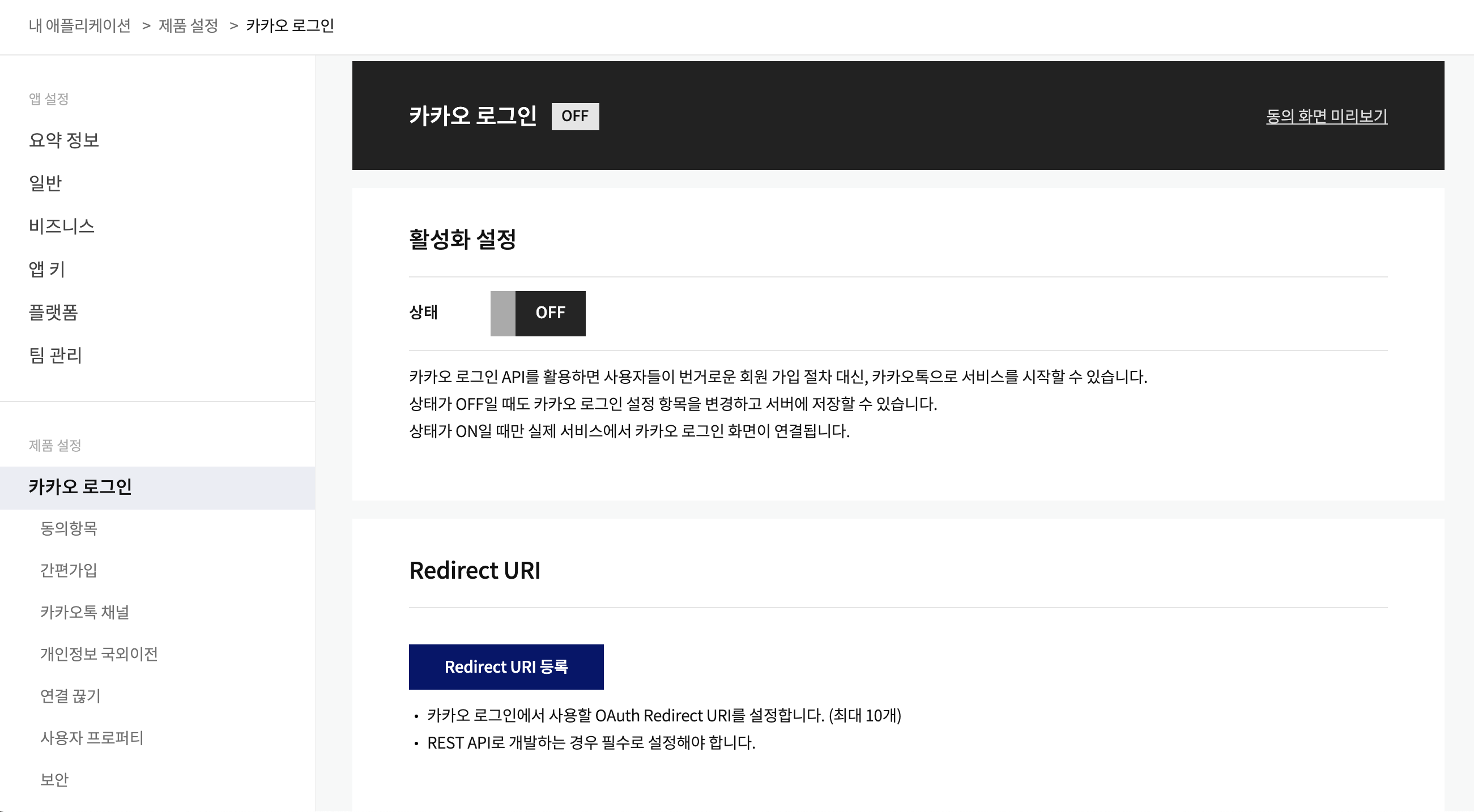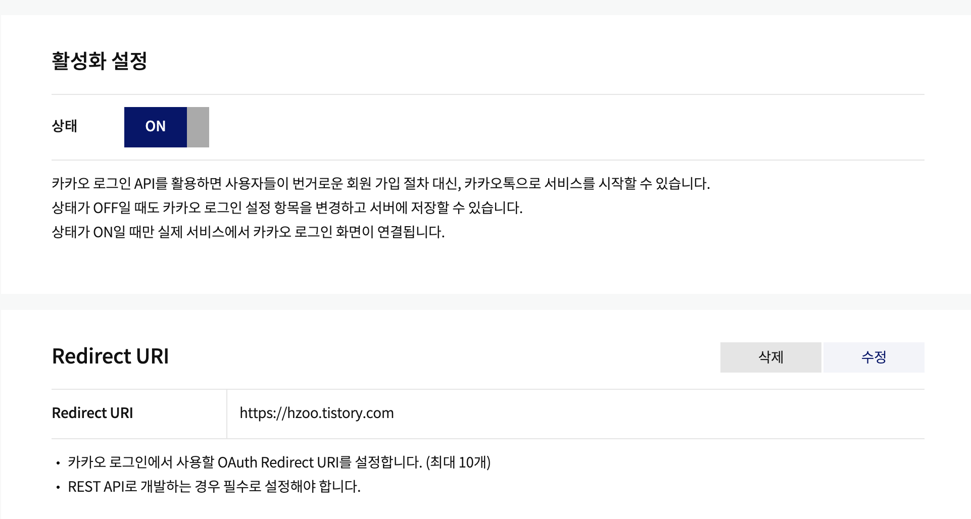 로그인 상태 활성화를 OFF에서 ON으로 변경하고, Redirect URI를 등록하면 된다.