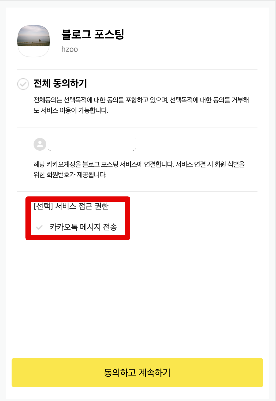 메세지 전송뿐만 아니라, 필요한 개인정보 및 접근권한 등을 선택하면 선택한 항목들이 반영된 동의 화면을 미리 볼 수 있다.