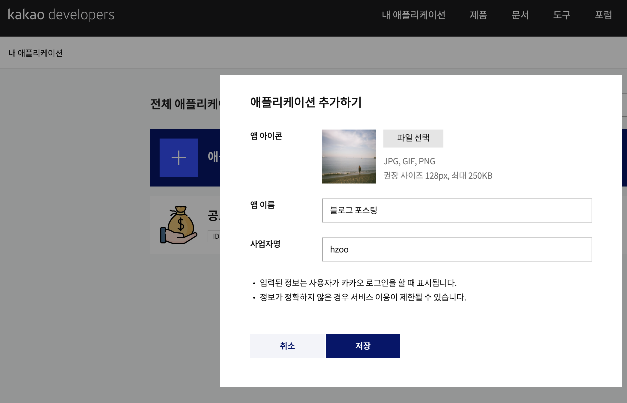 API 사용을 위해, kakao developers에 가입하여 애플리케이션을 생성해야 한다.