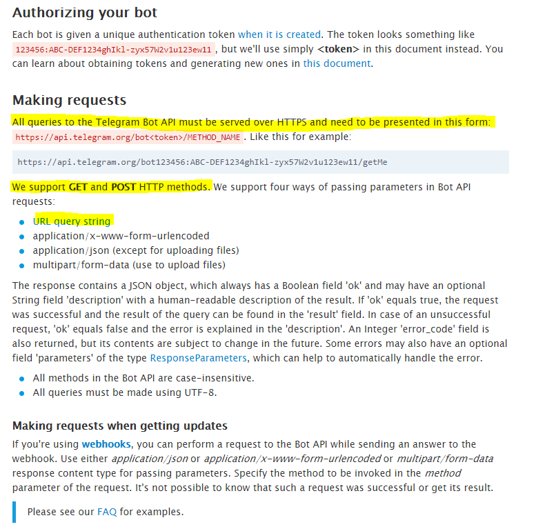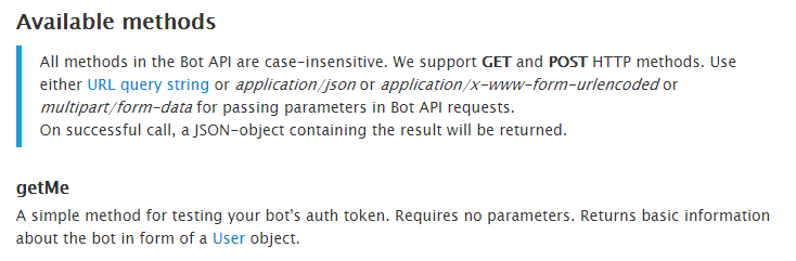 위 사진과 같이 텔레그램 봇 API는 https://api.telegram.org/bot<bot_token>/METHOD_NAME 형식으로,