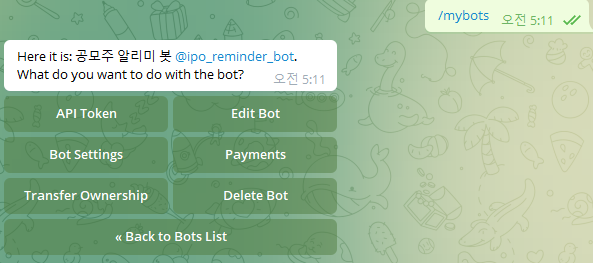 만약 봇 Token을 까먹거나, 수정사항이 있다면 /mybots를 선택하거나 입력하여 재확인할 수 있다.