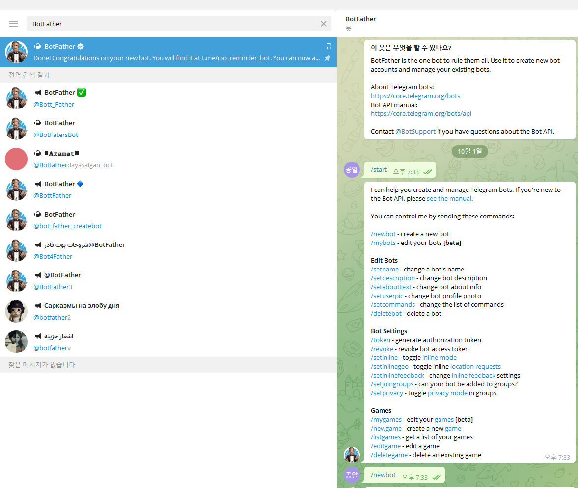 여기서 /newbot을 누르거나, 직접 검색하자.